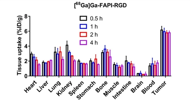 图4. αvβ3/FAP双靶点RDC在血液、肾、胰腺癌组织的摄取变化情况(4h)[4]