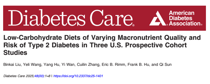 Liu B, Wang Y, Hu Y, Wan Y, Zhang C, Rimm EB, Hu FB, Sun Q. Low-Carbohydrate Diets of Varying Macronutrient Quality and Risk of Type 2 Diabetes in Three U.S. Prospective Cohort Studies. Diabetes Care. 2025 Sep 30:dc251401. doi: 10.2337/dc25-1401. Epub ahead of print. PMID: 41026687.