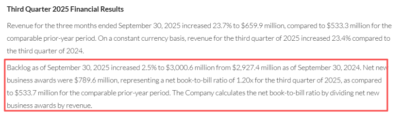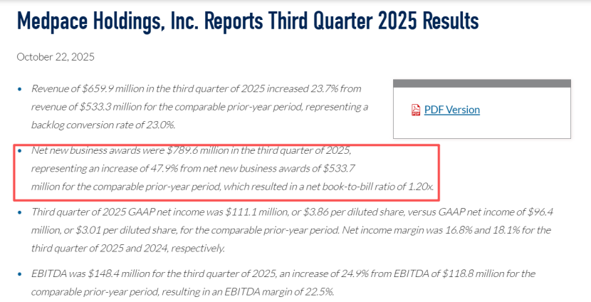 财报显示,Medpace在2025年第三季度实现收入6.60亿美元,同比大幅增长23.7%;实现净利润1.11亿美元,同比增长15.3%。这一增速不仅远超行业平均水平,也显示出公司增长势头强劲。更为难得的是,在收入高增长的同时,公司保持了非常健康的盈利能力。其核心利润指标(如EBITDA)增速与收入增速基本匹配,利润率稳定在较高水平。