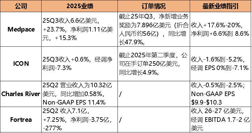 再看其他几家喜忧参半。ICON第三季度收入仅微增0.6%,经调整净利润下滑7.3%,业绩指引也相对疲软。Charles River第二季度收入近乎零增长,其全年业绩指引仍为负增长区间。Fortrea虽收入有所增长,但净利润仍深陷亏损。