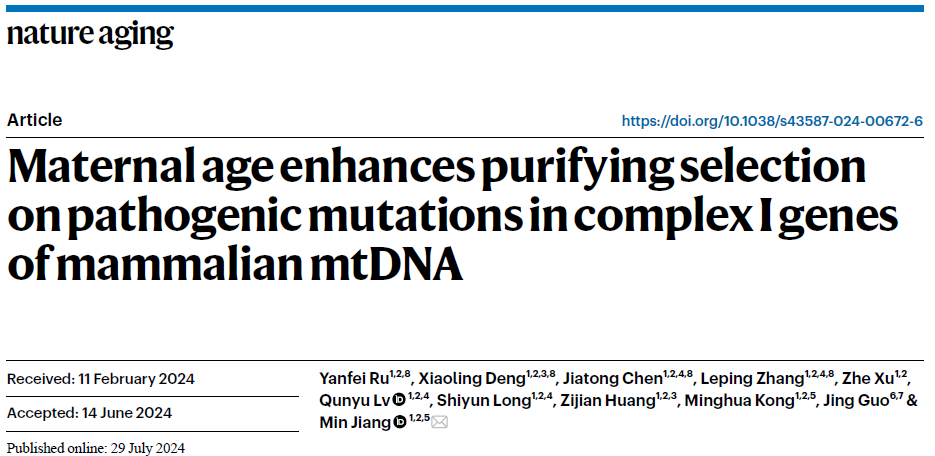[2] Ru Y, Deng X, Chen J, et al. Maternal age enhances purifying selection on pathogenic mutations in complex I genes of mammalian mtDNA. Nat Aging. 2024;4(9):1211-1230.