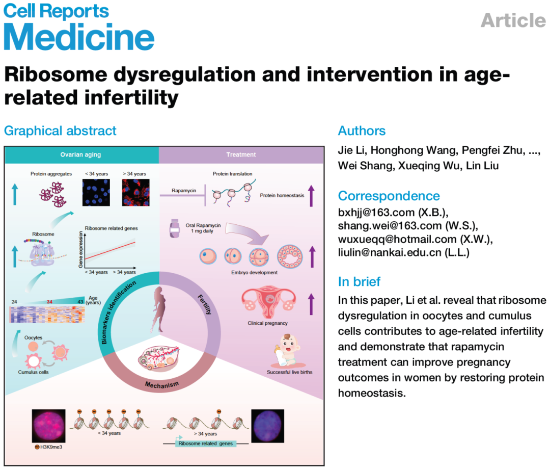 [1] Li J, Wang H, Zhu P, et al. Ribosome dysregulation and intervention in age-related infertility. Cell Rep Med. Published online October 27, 2025.