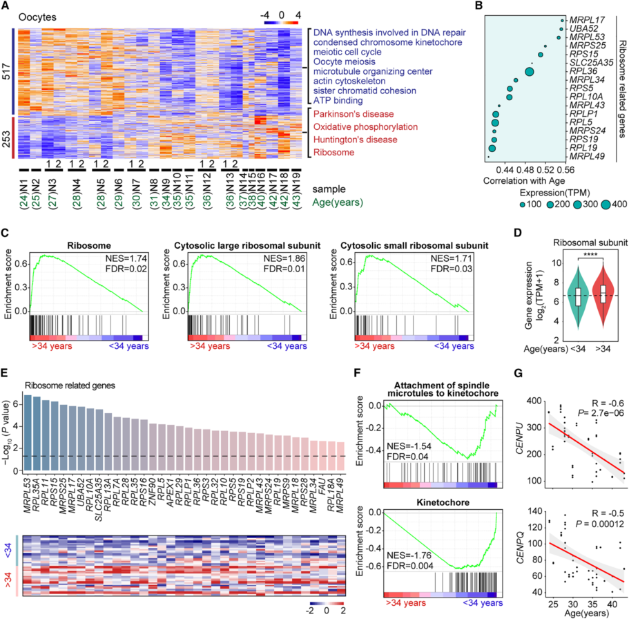 34岁起卵母细胞核糖体基因显著上调而减数分裂与纺锤体基因下调,图片来源自[1]