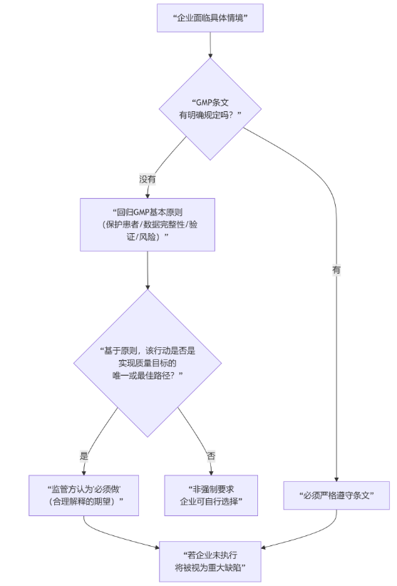 那么企业在一些具体事情上如何去判断该做不该作呢?个人认为GMP条文是最低标准和原则框架。监管方期望企业不仅遵守字面规定,更要理解规则背后的精神实质,并采取了所有科学合理且必要的措施来保证药品质量。