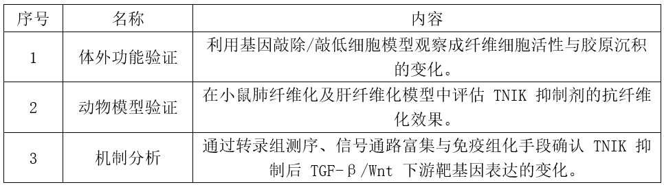 PandaOmics模块综合上述维度进行深入研究及排序、分类,得出一个与组织纤维化密切相关且具有可药性的高分候选靶点即TNIK。Insilico随后采用传统实验路径验证TNIK的功能作用,如表格所述。
