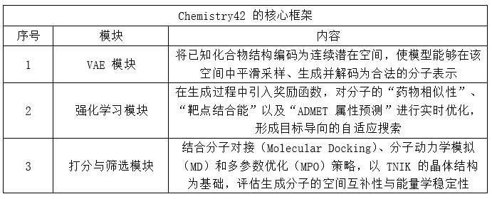 得出靶点后,Insilico借助Chemistry42生成式分子设计。Chemistry42核心框架如上述表格所述。Chemistry42在模型中嵌入了多重约束条件,以确保分子在药物开发路径上的综合可行性。