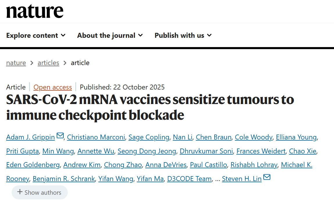 1.Grippin, A.J., Marconi, C., Copling, S. et al. SARS-CoV-2 mRNA vaccines sensitize tumours to immune checkpoint blockade. Nature (2025). https://doi.org/10.1038/s41586-025-09655-y