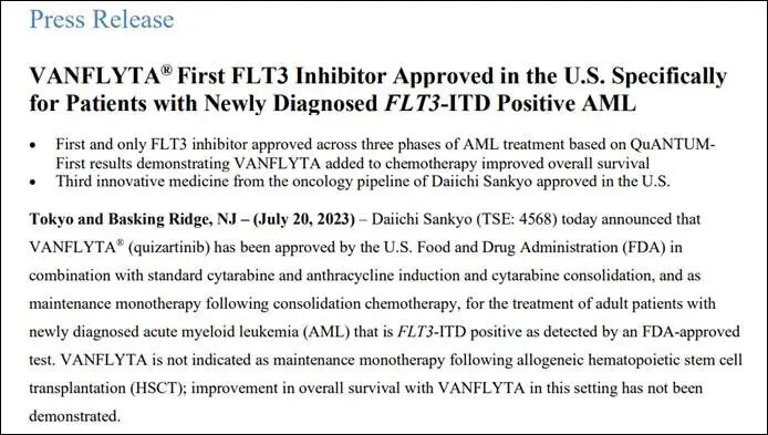 [5] VANFLYTA® First FLT3 Inhibitor Approved in the U.S. Specifically for Patients with Newly Diagnosed FLT3-ITD Positive AML. Retrieved July 21, 2023 from https://www.daiichisankyo.com/files/news/pressrelease/pdf/202307/20230720_E.pdf