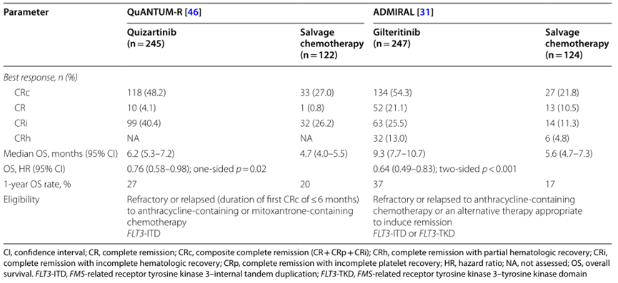 此外,QuANTUM-R和ADMIRAL临床研究还评估了 Quizartinib 和 Gilteritinib 在治疗FLT3-ITD阳性和FLT3突变 (包括ITD和TKD) 阳性的复发/难治性(R/R)AML患者中的疗效。研究结果显示,两种药物均显著提高了患者的总生存期,其中 Quizartinib 在FLT3-ITD阳性患者中展现出更大的优势。
