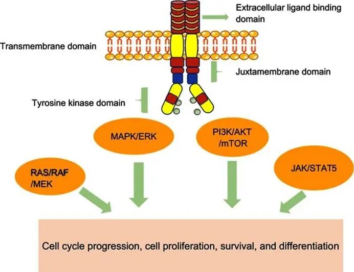 图1. FLT3基因编码的蛋白质结构及由FLT3受体激活启动的相关途径