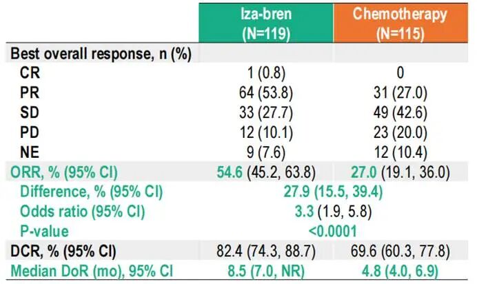iza-bren 的整体安全性良好,常见的治疗相关不良事件(TRAE)为血液学毒性,如中性粒细胞减少等,可通过临床标准措施进行有效管理。因TRAE导致的停药率低,仅1.8%-2.6%,未观察到新的安全性信号,表明患者能够坚持治疗,从而获得长期的生存获益。