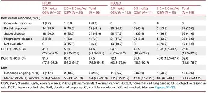 l 铂耐药卵巢癌(PROC):3.0mg/kg q3w剂量组的ORR为43.1%,中位PFS为7.2个月。