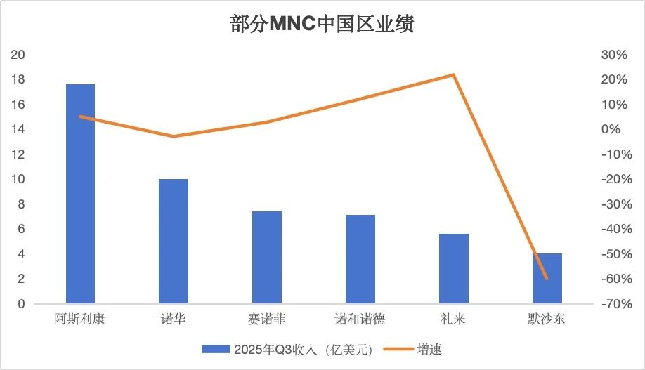 整体来看,2025年第三季度,跨国药企在中国市场的业绩呈现出显著的两极分化态势:默沙东业绩暴跌超60%,诺华也小幅下滑3%;与之相对的,是诺和诺德与礼来两位GLP-1“双姝”的双位数猛增,前者增长12%,后者高达22%;此外,阿斯利康、罗氏、赛诺菲等MNC依旧维持个位数的稳健增长。