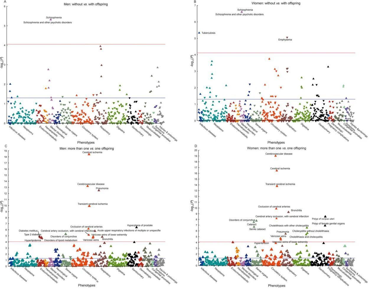 X轴表示疾病分类组,Y轴表示表型组P值的负对数;紫色和红色线分别表示0.05显著性水平阈值和表型组显著性阈值;向上和向下三角分别表示比值比≥1和比值比<1。其中(A) 无子女与有子女男性的PheWAS图谱;(B) 无子女与有子女女性的PheWAS图谱;(C) 育有两名以上子女与一名子女男性的PheWAS图谱;(D) 育有两名以上子女与一名子女女性的PheWAS图谱。