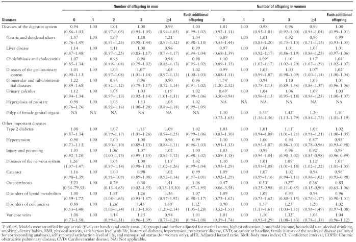 表:在男性和女性中,生育子女的数量与发病风险之间的关系