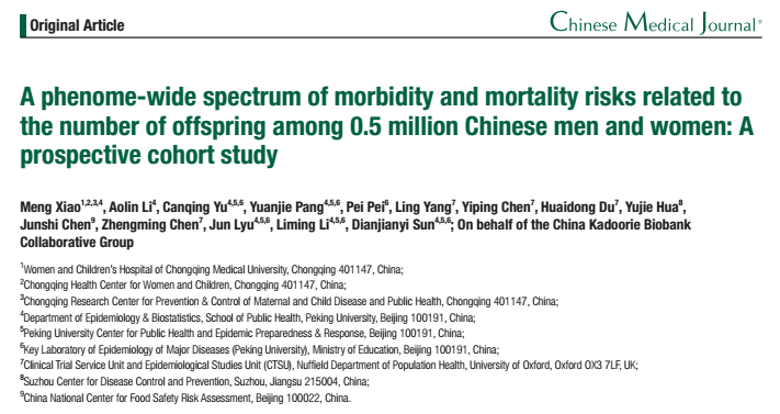参考文献:Xiao M, Li A, Yu C, Pang Y, Pei P, Yang L, Chen Y, Du H, Hua Y, Chen J, Chen Z, Lyu J, Li L, Sun D; China Kadoorie Biobank Collaborative Group. A phenome-wide spectrum of morbidity and mortality risks related to the number of offspring among 0.5 million Chinese men and women: A prospective cohort study. Chin Med J (Engl). 2025 Oct 9. doi: 10.1097/CM9.0000000000003815. Epub ahead of print. PMID: 41069018.