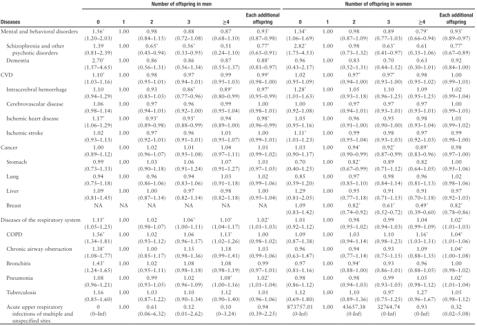 接着,研究者将目光聚焦于那些多子女的父母。他们发现,和只有1个孩子的人比,多生几个孩子,对部分疾病是 “保护作用”,但也可能增加某些病的风险,男女差异很大:
