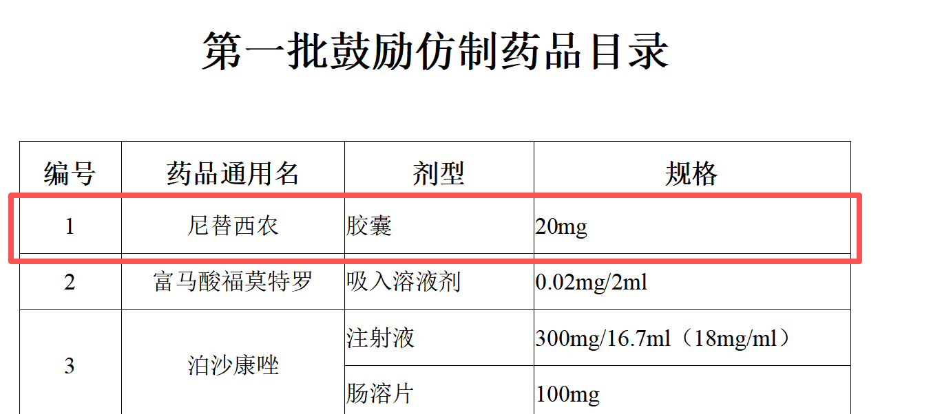 该药用于酪氨酸血症Ⅰ型,这个药同样也是一个很有代表性的品种,这个品种被列入2019年国家卫健委《第一批鼓励仿制药品目录》的首位。