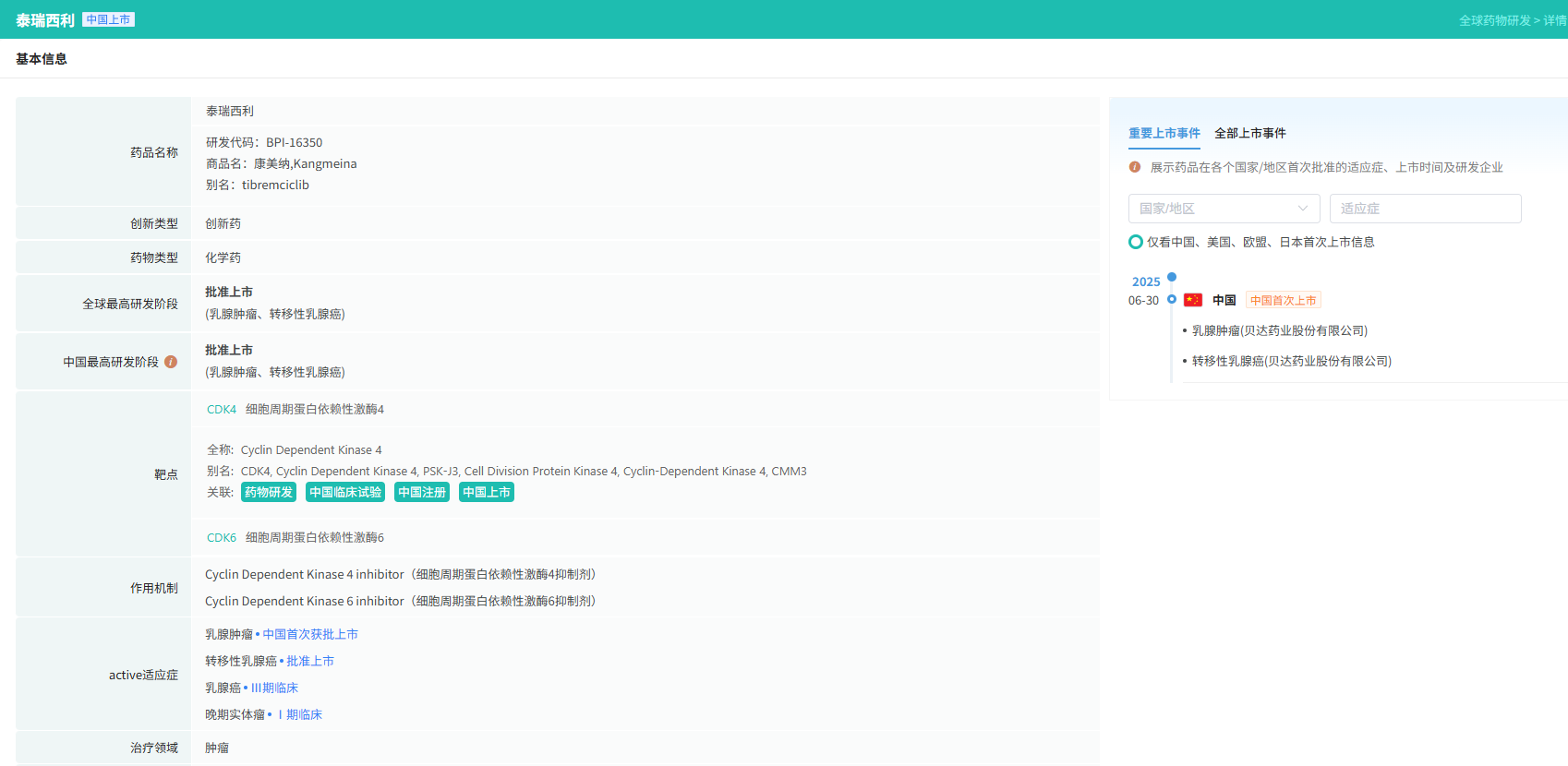 贝达药业的1类创新药酒石酸泰瑞西利胶囊上市(商品名:康美纳),联合氟维司群,适用于既往接受内分泌治疗后进展的激素受体(HR)阳性、人表皮生长因子受体2(HER2)阴性的局部晚期或转移性成年乳腺癌患者。