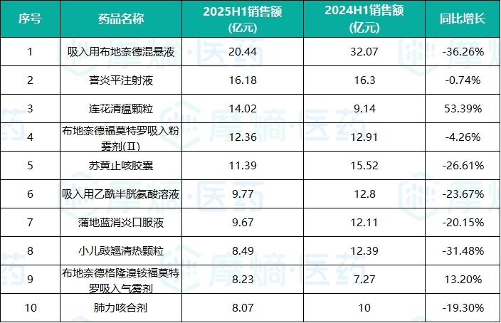 在全国医院终端市场,2025年上半年呼吸系统药物销售额为579.24亿元,同比下降13.33%;其中,医院端销售TOP10药品分别是:吸入用布地奈德混悬液、喜炎平注射液、连花清瘟颗粒、布地奈德福莫特罗吸入粉雾剂(Ⅱ)、苏黄止咳胶囊、吸入用乙酰半胱氨酸溶液、蒲地蓝消炎口服液、小儿豉翘清热颗粒、布地奈德格隆溴铵福莫特罗吸入气雾剂、肺力咳合剂。
