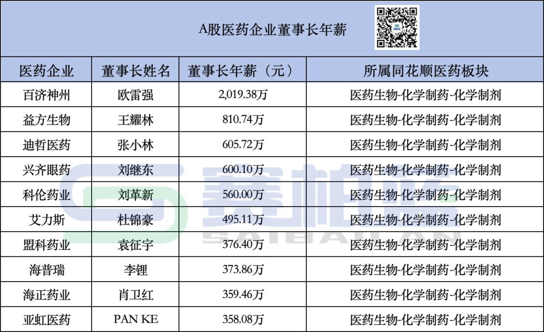 A股中药板块董事长年薪TOP10呈现薪酬集中化特征,整体差距相对不大。济川药业曹龙祥以432.86万元年薪位居榜首,亚宝药业任武贤、奇正藏药刘凯列分别以427.49万元、363.54万元紧随其后。