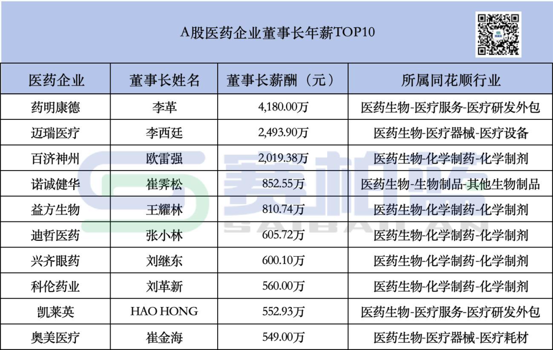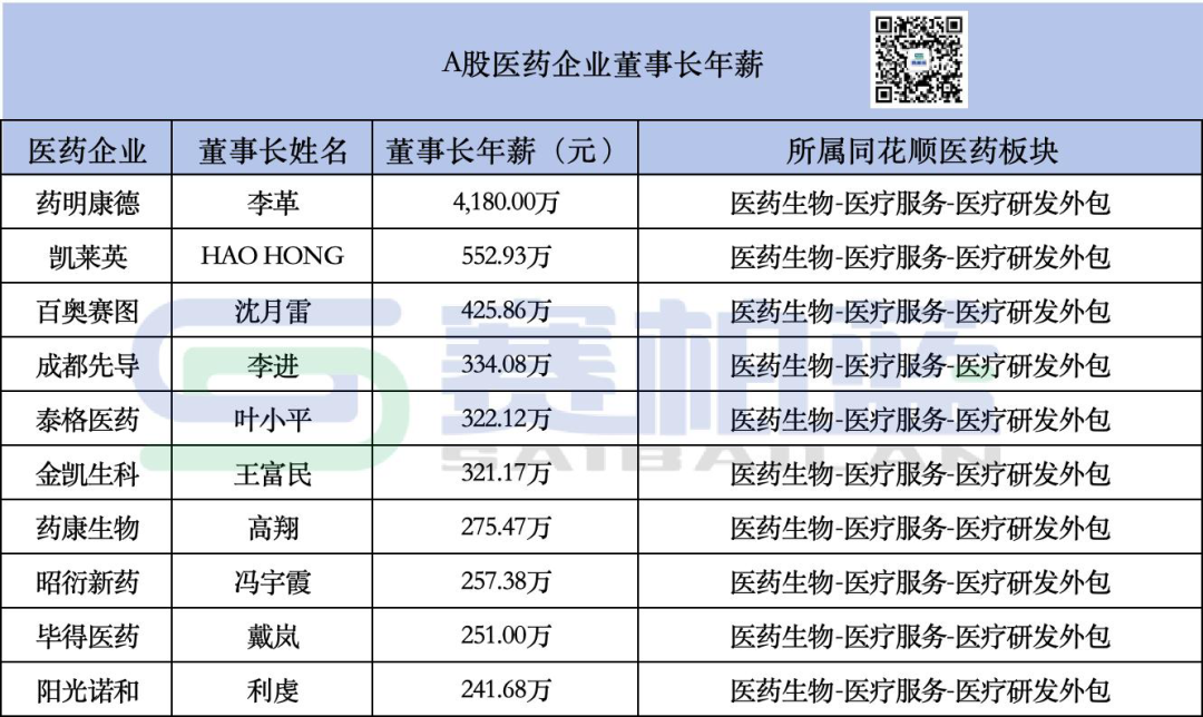 A股医疗研发外包板块董事长年薪TOP10中,药明康德的李革以年薪4180万元排在首位,且遥遥领先于其他企业,其次是凯莱英的HAO HONG(552.93万元)、百奥赛图的沈月雷(425.86万元)等。