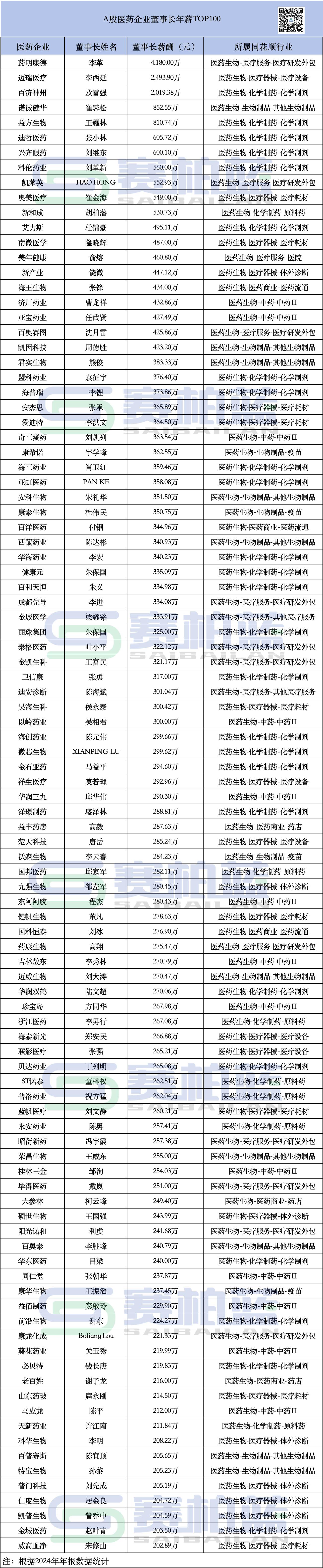 附:A股医药企业董事长年薪TOP100(根据2024年年报数据;数据来源:同花顺问财)