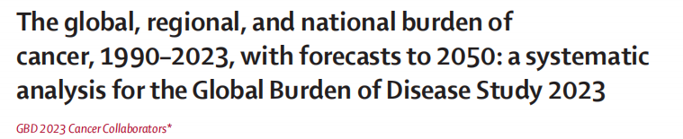 参考文献:GBD 2023 Cancer Collaborators. The global, regional, and national burden of cancer, 1990-2023, with forecasts to 2050: a systematic analysis for the Global Burden of Disease Study 2023. Lancet. 2025 Oct 11;406(10512):1565-1586. doi: 10.1016/S0140-6736(25)01635-6. Epub 2025 Sep 24. PMID: 41015051.