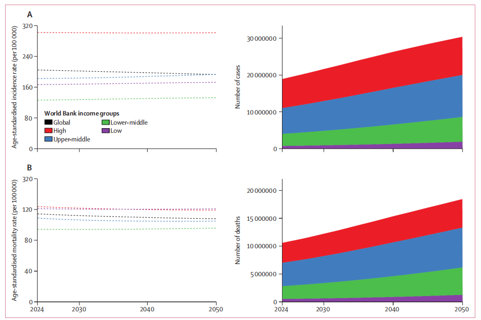 图4:全球癌症(A)发病率与(B)死亡率按年龄标准化率及统计数字呈现,涵盖2024至2050年期间,按世界银行收入组别划分,所有年龄段与性别合并统计