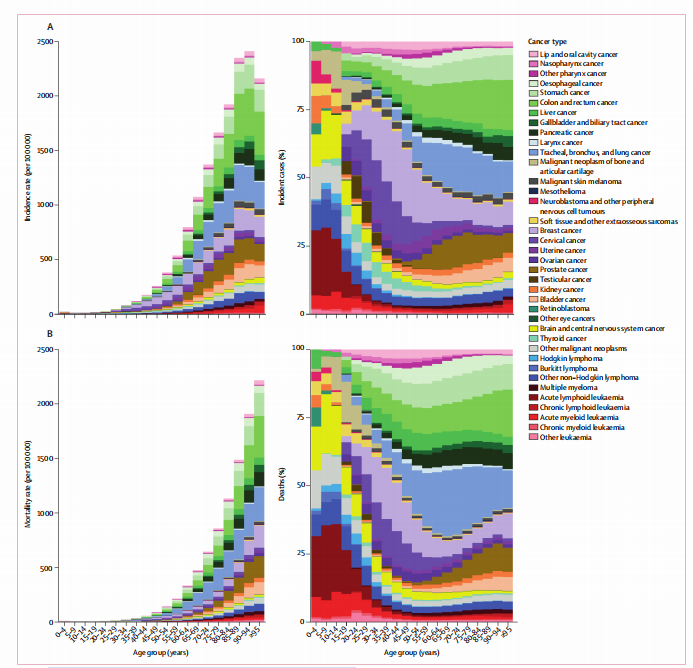 图3:2023年全球各年龄段癌症(A)发病率与(B)死亡率(男女合计)