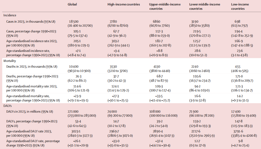 1. 绘制全景地图:量化1990年至2023年间,全球204个国家和地区、47种癌症的发病率、死亡率、致残率等综合负担。