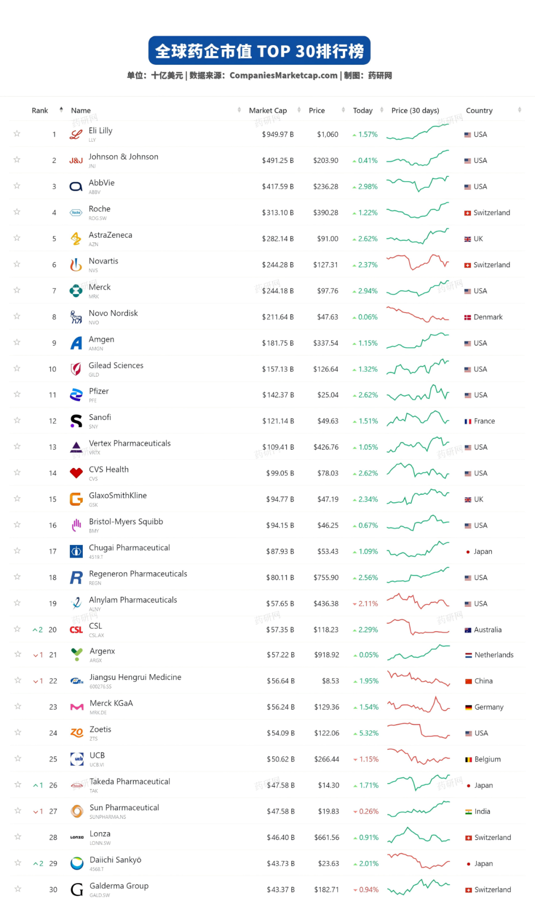 值得注意的是,中国药企恒瑞医药以约567亿美元市值跻身第22位,成为本次TOP30榜单中唯一一家来自中国的企业,标志着中国创新药力量正在获得全球资本市场的系统性认可。这一突破性进展预示着全球医药格局可能迎来更深层次的重构。