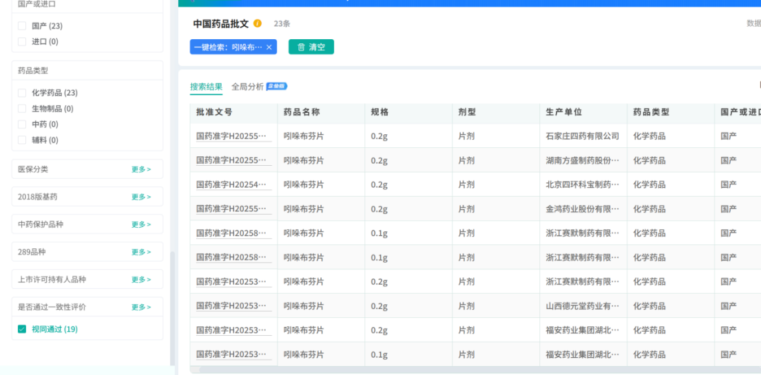 比如吲哚布芬片,销售额从2019年的1.49亿,一路攀升到2024年的18.59亿,中美华东笑开了花,其他企业也馋得口水直流,从摩熵医药数据库可以看出,目前有19家企业视同通过一致性评价,几乎都是在2024年之后获批的,后续还有不少申报在追赶,甚至2025年还有企业在开展BE。