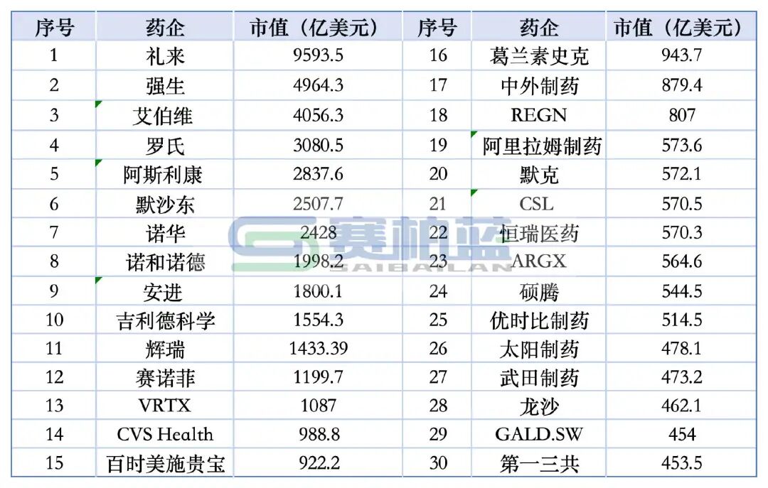 那么,目前全球制药巨头的市值格局如何?赛柏蓝统计了11月25日的排行情况: