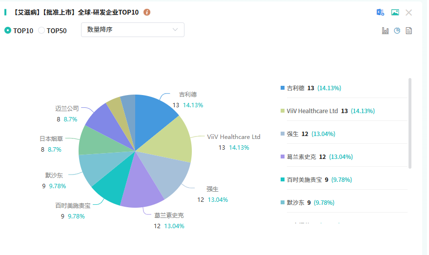 众多知名药企纷纷投身于这一领域的研发竞争,吉利德、葛兰素史克、强生、默沙东等国际药企是主要参与者。在全球药物研发获批的TOP10榜单中,吉利德凭借超14%的市场份额独占鳌头。国内制药企业也不甘落后,艾迪药业、上海复星医药等积极布局,努力在HIV药物市场占据一席之地。