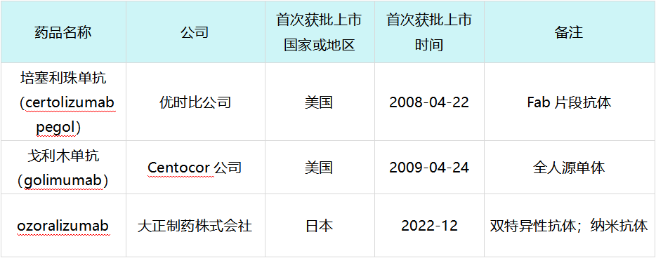 修美乐上市后全球范围内获批上市的TNF抑制剂创新药