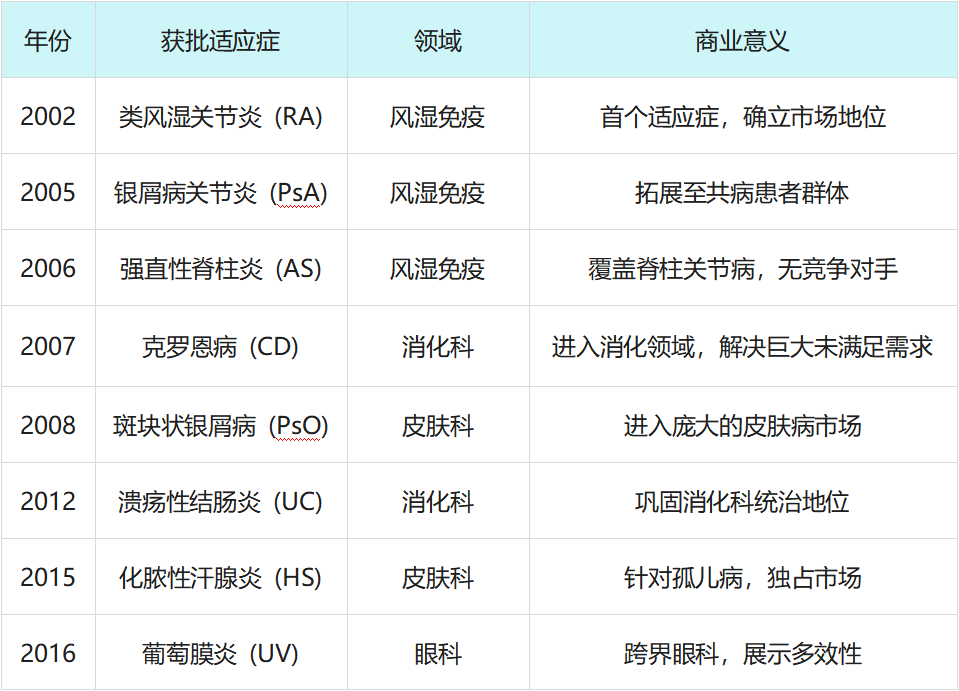 这种“滚雪球”式的适应症拓展,使得修美乐的患者群体呈几何级数增长。每一个新适应症的获批,都伴随着数十亿美元销售额的增长。