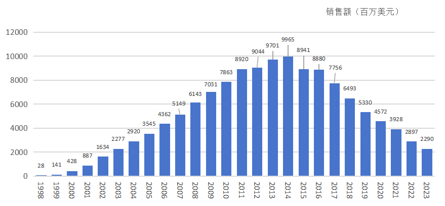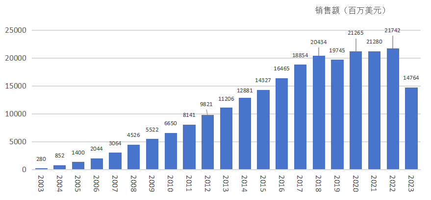 - 2023年:随着类似药上市,修美乐全球销售额开始下滑,降至144亿美元。