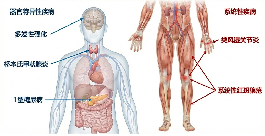 目前已知的自身免疫性疾病种类繁多,超过80种,其临床表现千差万别,但病理本质均为免疫耐受的崩溃。根据攻击目标的范围,这些疾病主要分为两大类: