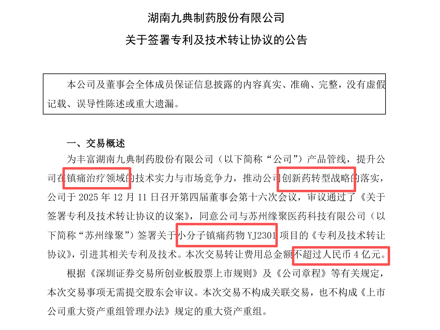 12月11日,九典制药发布公告称,公司拟4亿元引进镇痛新药 YJ2301 项目,加码“创新药转型”战略,此举有助于构建长期核心竞争力。
