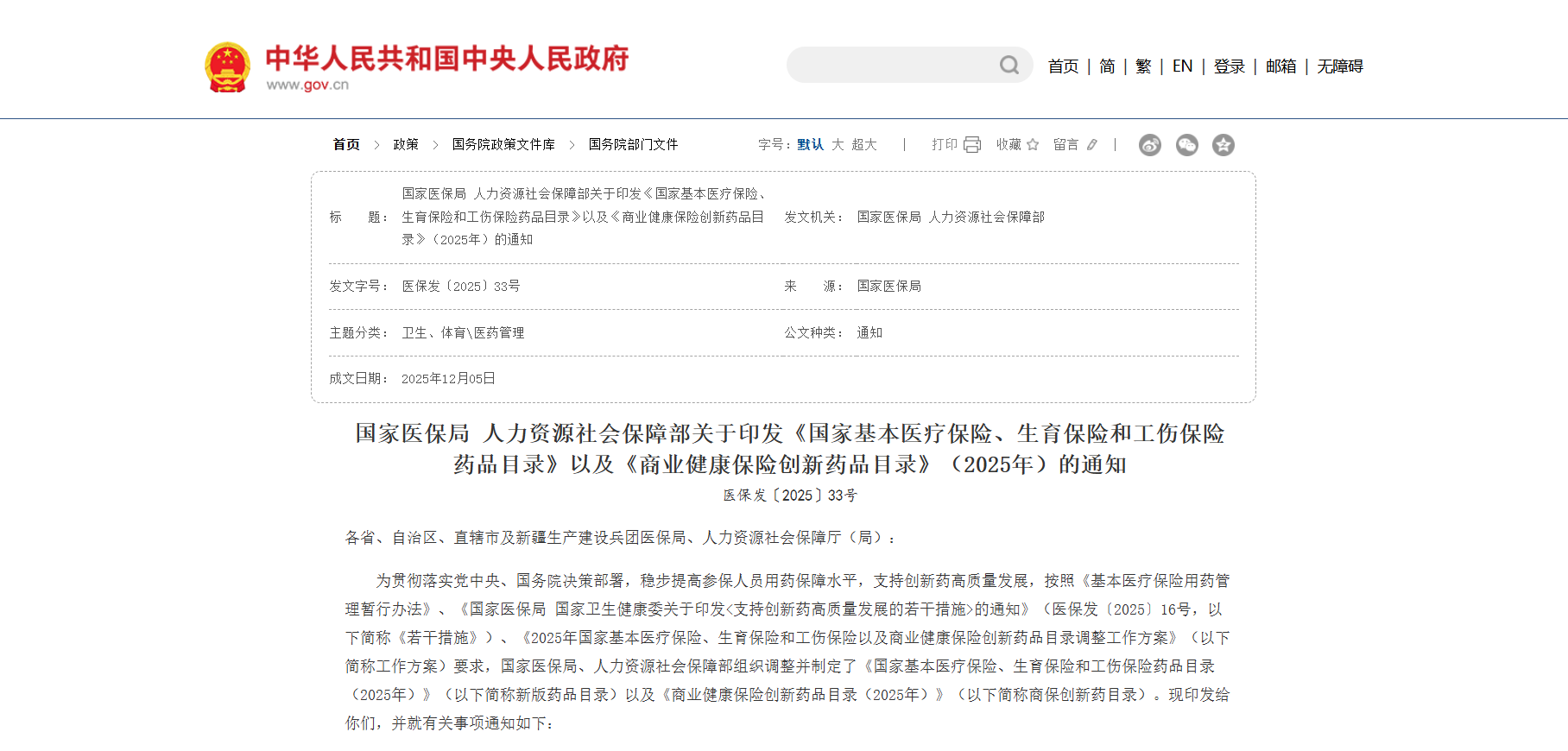 [1] 国家医疗保障局,人力资源社会保障部.国家医保局人力资源社会保障部关于印发《国家基本医疗保险、生育保险和工伤保险药品目录》以及《商业健康保险创新药品目录》(2025年)的通知(医保发〔2025〕33号).
