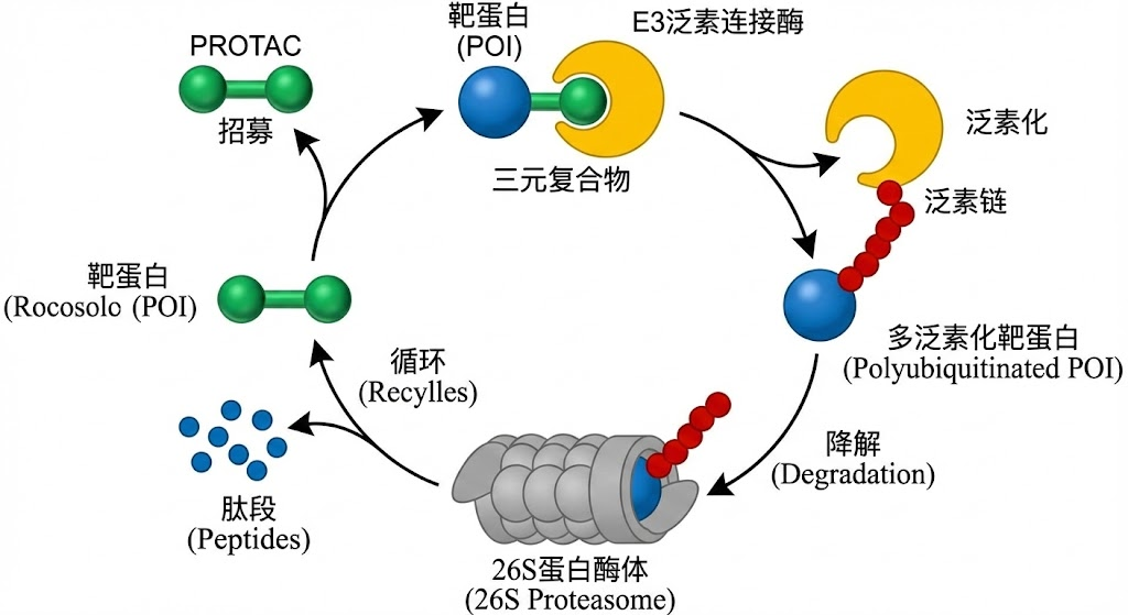 现代药物发现不再局限于正位竞争,而是转向变构调节。通过结合在远离活性中心的变构位点,药物可以“锁定”蛋白质的某种特定构象(如非活性态或特定的功能态),或者改变其构象转换的动力学参数。此外,针对蛋白质组装界面的干扰剂、利用PROTAC技术劫持泛素化降解系统,都是基于对蛋白质动态生命周期深刻理解的产物。