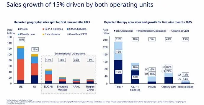 诺和诺德的增长神话,建立在美国市场的绝对主导之上。2025年前九个月,美国贡献了超过六成收入,其中 Wegovy® 推动肥胖护理板块CER增长达41%。但GLP-1糖尿病板块在美国仅增长10%,显示注射剂渗透已接近天花板。诺和诺德在美国的“高增长”依赖的是 Wegovy® 的爆发式放量,而非整体产品线扩张。