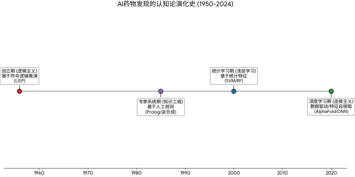 专家系统期(知识工程): 1980年代,以Prolog语言和E.J. Corey的逆合成分析系统为代表。核心思想是将有机化学家的经验固化为成千上万条“如果-那么”规则。虽然能解决特定问题,但缺乏泛化能力,无法处理未知领域的知识。