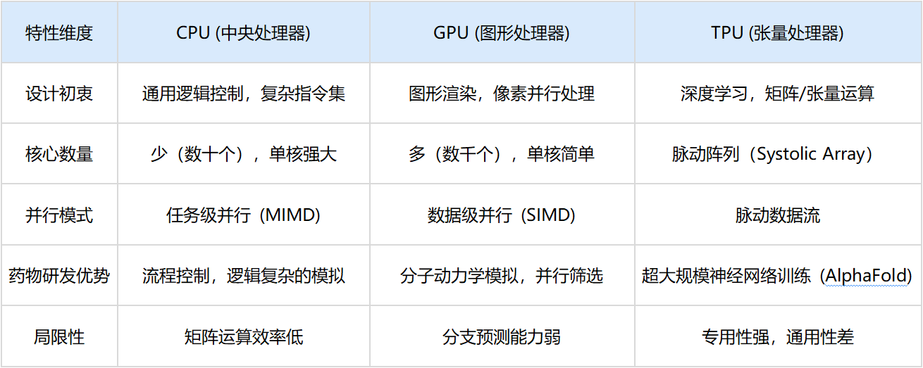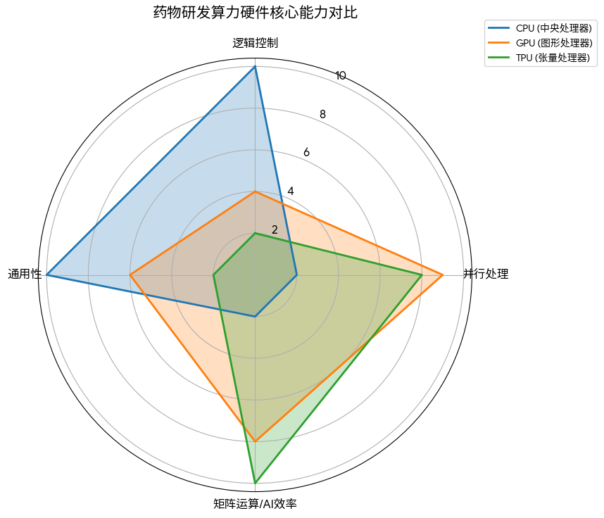 CPU擅长处理复杂的逻辑分支和即时响应,如操作系统的调度。但在药物发现中,面对数百万分子的相似性计算,CPU的串行处理能力显得力不从心 。