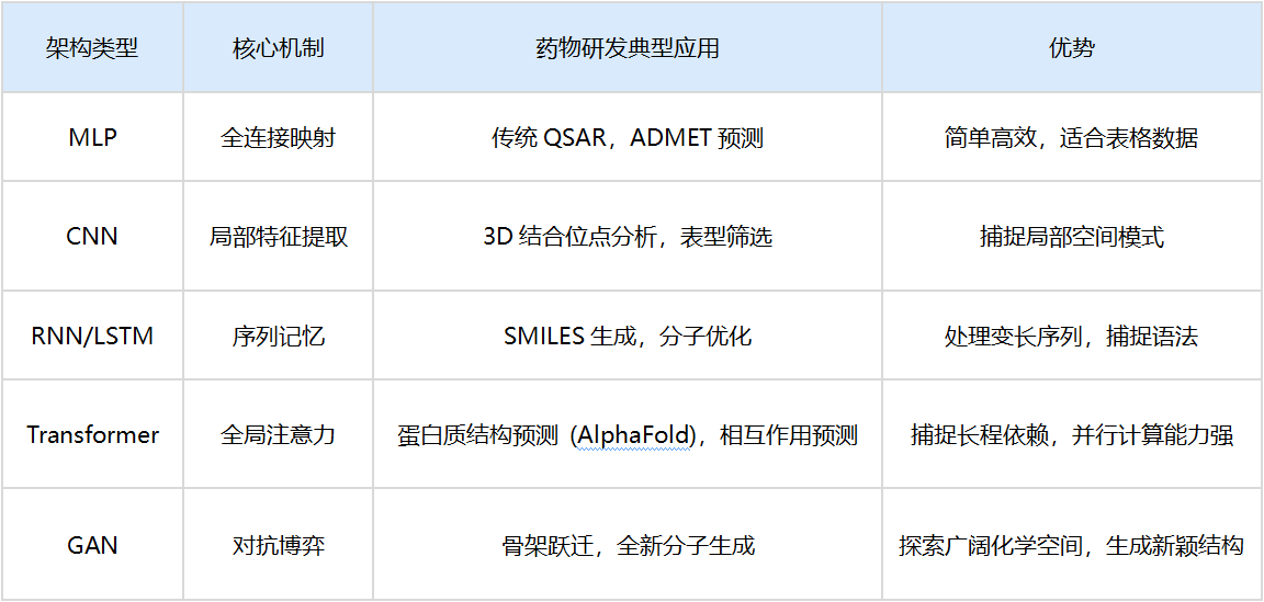 针对不同类型的化学数据(向量、图像、序列、图),深度学习演化出了多种专门的架构,重塑了药物设计的各个环节。