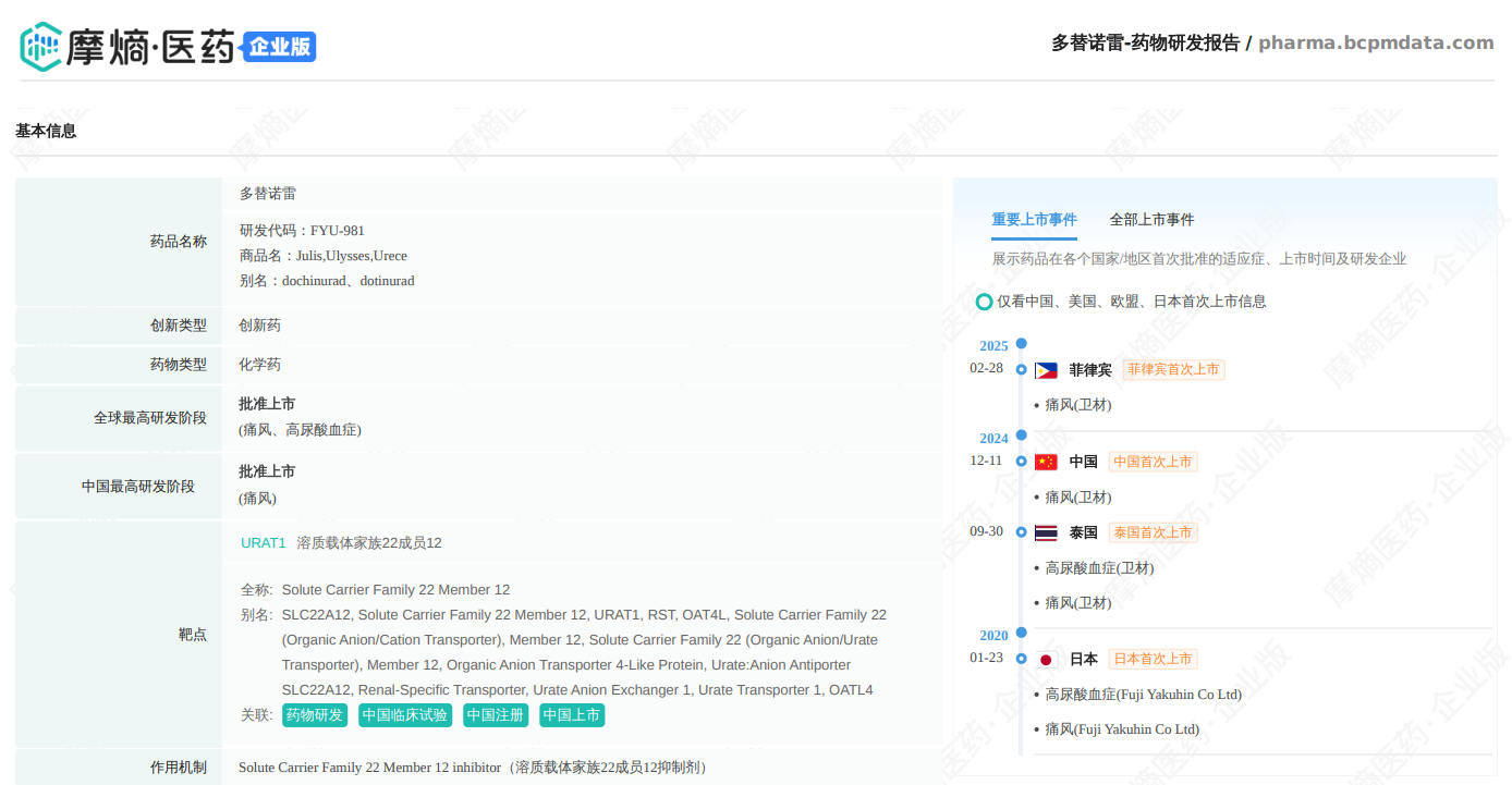 查数据,找摩熵!想要解锁更多药物研发信息吗?查询摩熵医药(原药融云)数据库(vip.pharnexcloud.com/?zmt-mhwz)掌握药物基本信息、市场竞争格局、销售情况与各维度分析、药企研发进展、临床试验情况、申报审批情况、各国上市情况、最新市场动态、市场规模与前景等,以及帮助企业抉择可否投入时提供数据参考!注册立享15天免费试用!