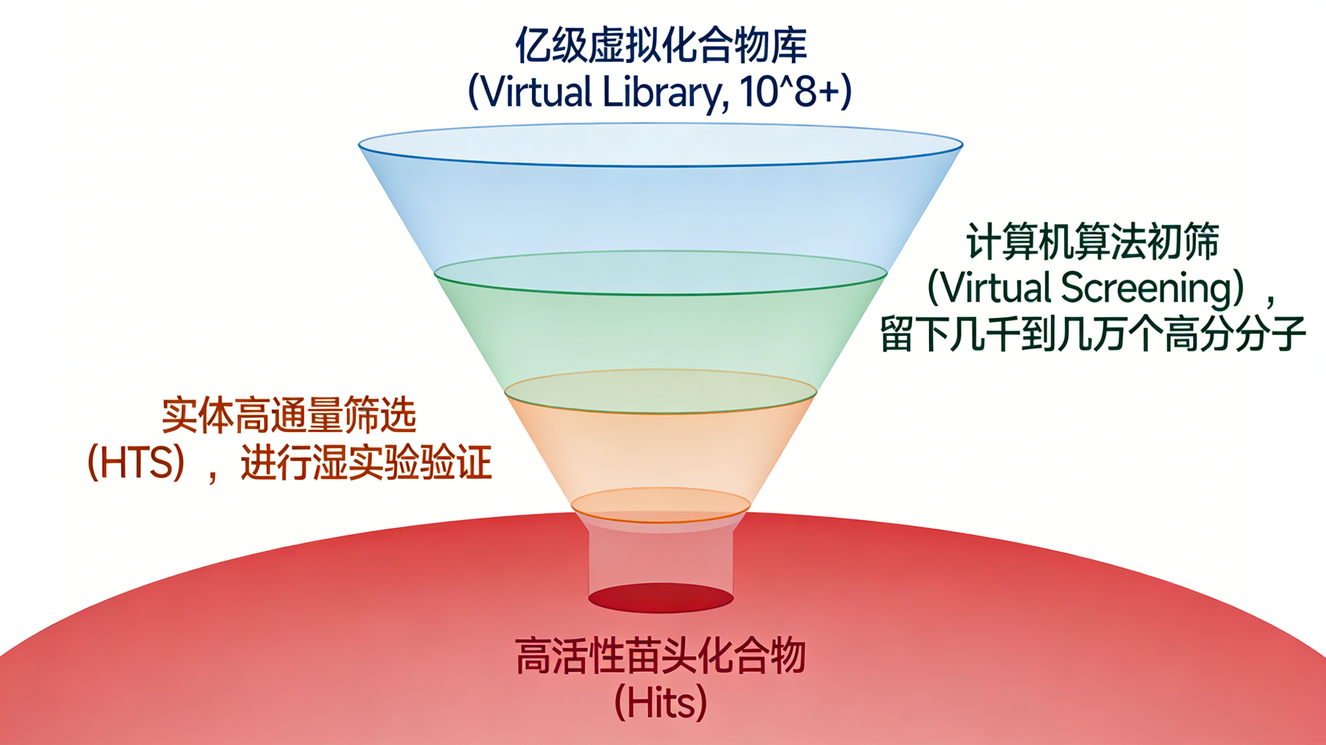 - 漏斗策略: 科学家不再将所有百万级实体化合物直接送入HTS,而是先利用计算机算法对亿级虚拟库进行初筛,遴选出评分最高的100~10,000种化合物,再进行实体验证。这种“干湿结合”的漏斗模式,显著降低了实验成本,提高了筛选的命中率。