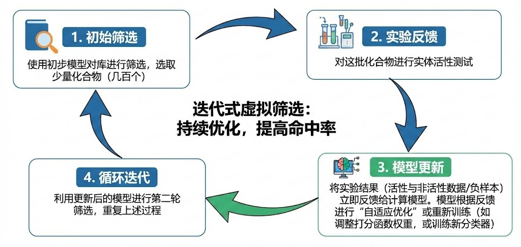 传统的线性筛选流程是:计算筛选 → 购买/合成 → 实验测试 → 结束。而迭代筛选将这一过程变为一个闭环。