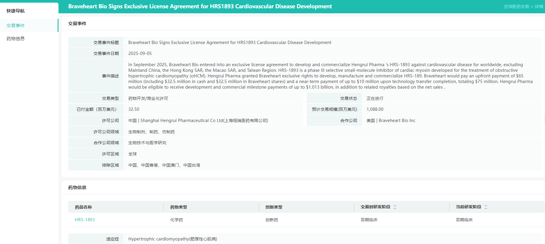 - 交易:据摩熵医药数据库-全球医药交易显示,恒瑞将HRS-1893授权给Braveheart Bio,首付款6500万美元(现金+股权),总里程碑超10亿美元。该药物直接对标BMS的重磅炸弹Mavacamten,具有更优的药代动力学特征。